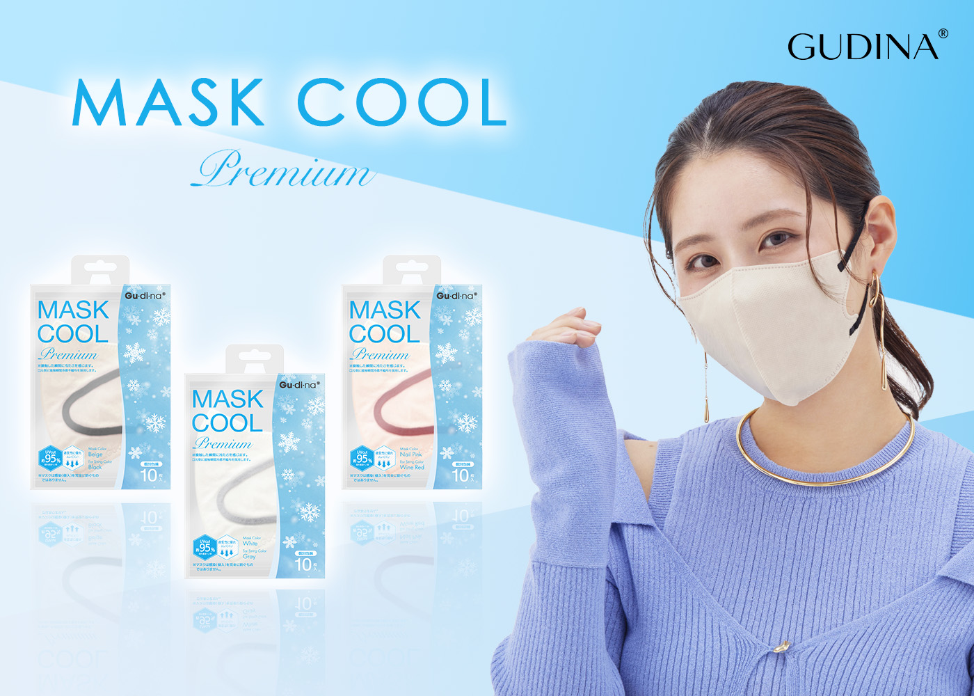 2025年10月7日 / 触れた瞬間、ひんやりと、とろけるように。紫外線も、熱も、肌ストレスも。夏の素肌を、美しく守る“冷感マスク。 真夏の肌を、もっと快適に、もっと美しく。 「GUDINA COOL SILK」は、極上の冷感繊維と高密度UVカット機能を融合した “プレミアム冷感マスク”。 接触冷感生地が肌温度をやさしく下げ、 UVカット(UPF50+)仕様で紫外線から素肌を守ります。 さらに抗菌防臭加工で清潔を保ち、長時間つけてもさらりと快適。