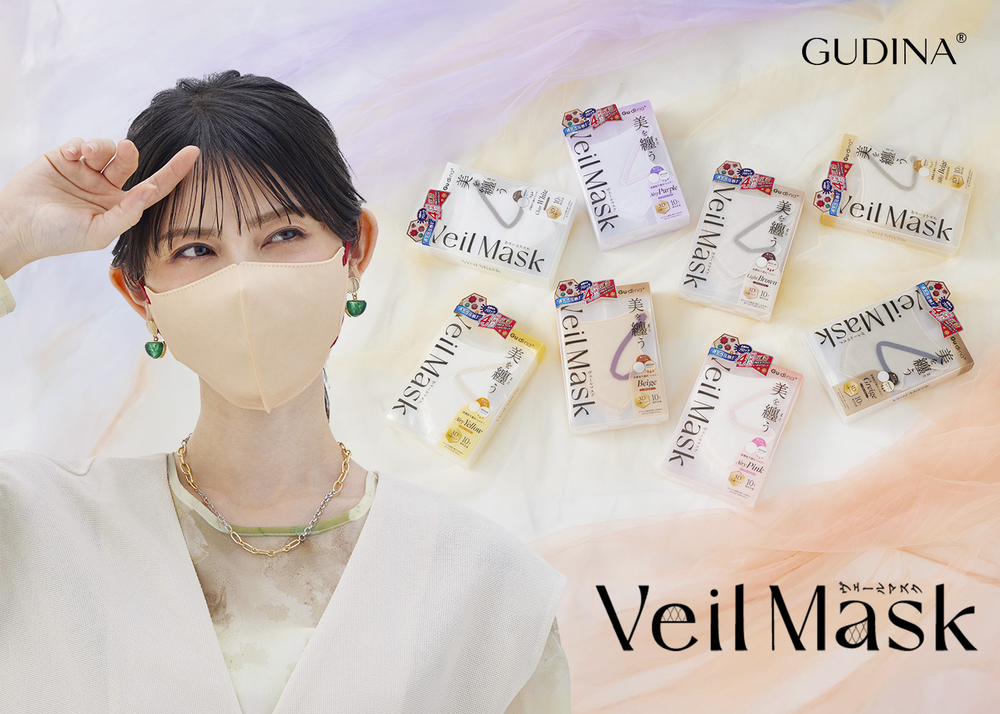 美しい発色、息づく透明感。高通気ヴェール製法が、呼吸するたびに肌を美しく魅せる。 「GUDINA Veil Mask」は、肌をやさしく包み込みながら、光と空気を自在に操る高通気ヴェール構造を採用。極細エアリーファイバーが空気を含み、肌との摩擦を最小限に抑え、長時間の装着でも息苦しさを感じさせません。Air & Aura Technology™空気(Air)とオーラ(Aura)が調和する、GUDINA独自の製法。高通気と美発色を融合させた、“呼吸するスキンケアヴェール”。 詳しくこちら